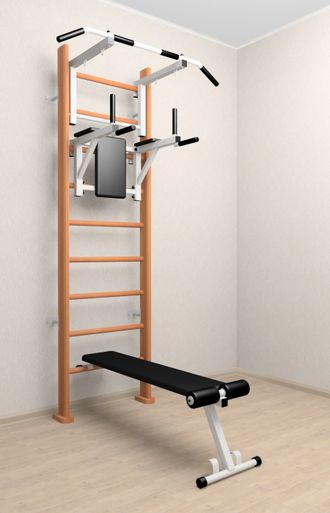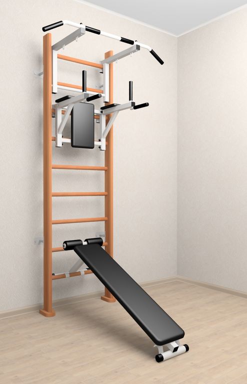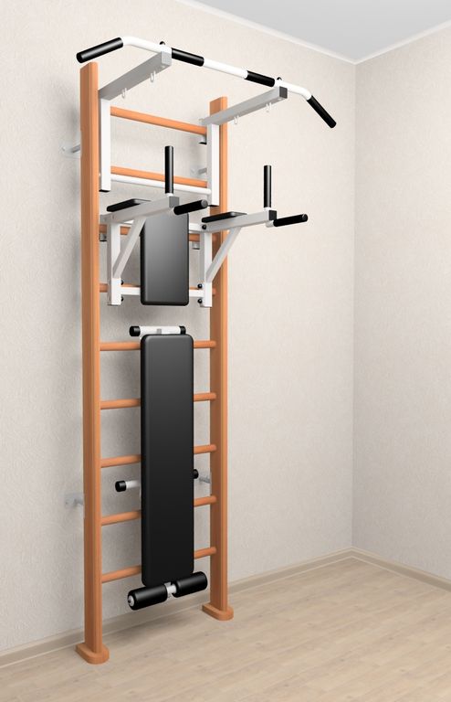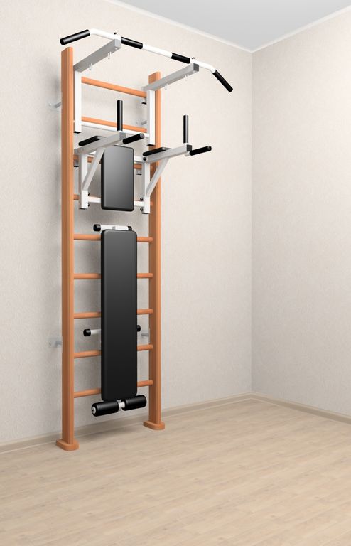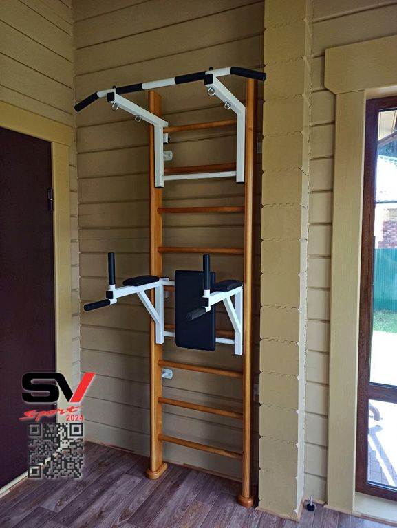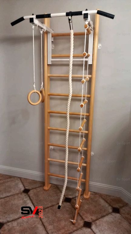 Стойки деревянной шведской стенки изготовлены из массива сосны 100 х 40 мм. Ступени из березы D40 мм.